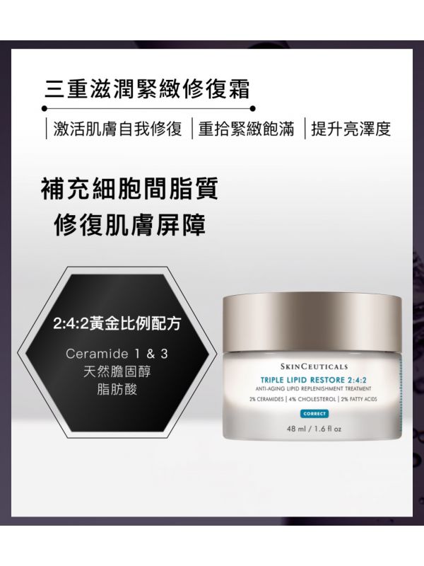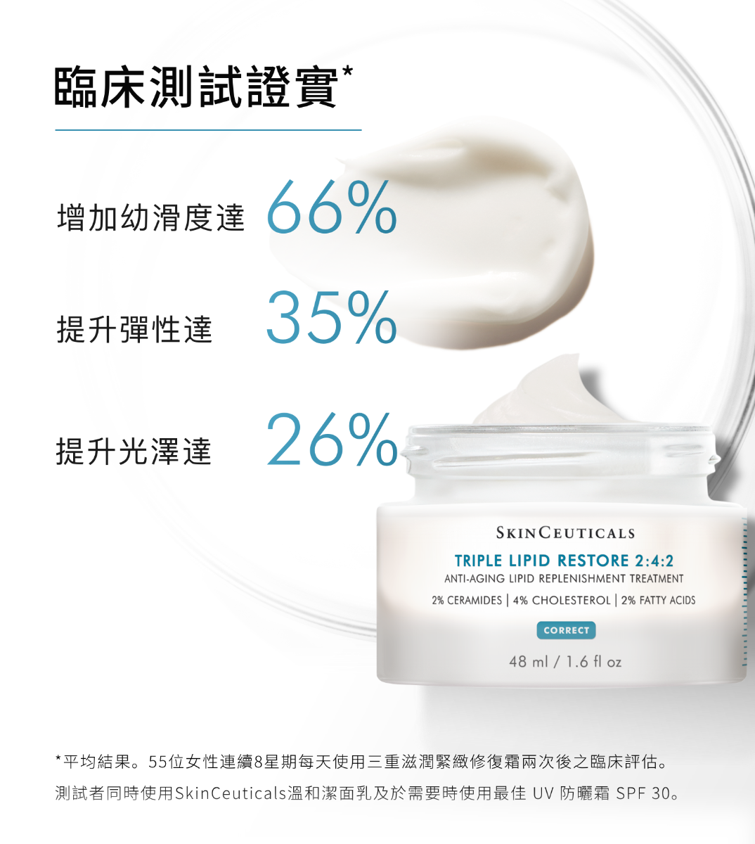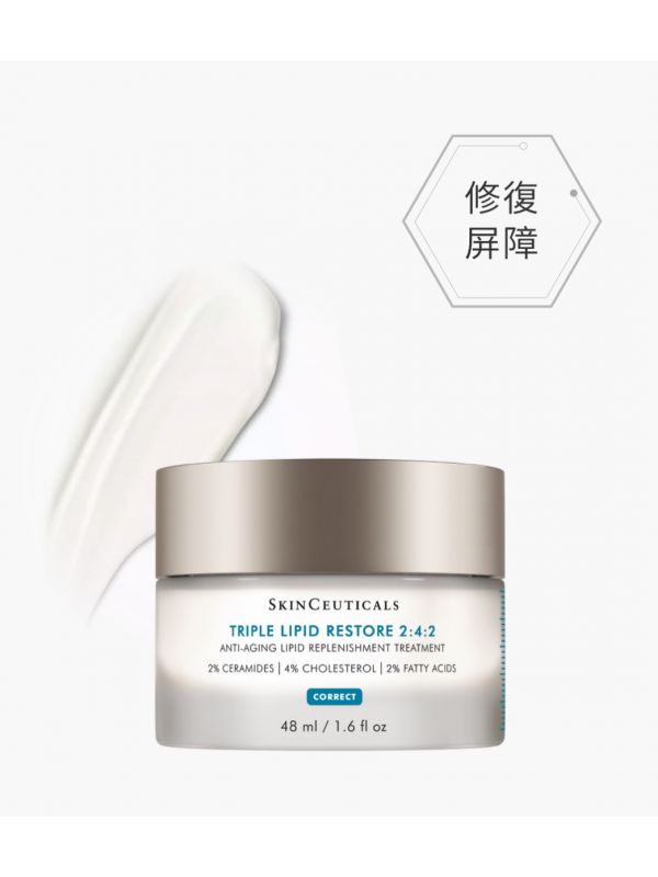 Triple Lipid Restore 2:4:2 is an anti aging cream formulated with a maximized concentration of lipids: 2% ceramides, 4% natural cholesterol, and 2% fatty acids. This unique anti aging lipid correction cream contains the first 2:4:2 cholesterol-dominant ratio to help restore skin's external barrier and support natural self-repair, while potently nourishing aging skin for improvement in visible signs of accelerated aging. Triple Lipid Restore 2:4:2 has been clinically proven to improve the visible appearance of skin smoothness, laxity, pores, and overall radiance.
