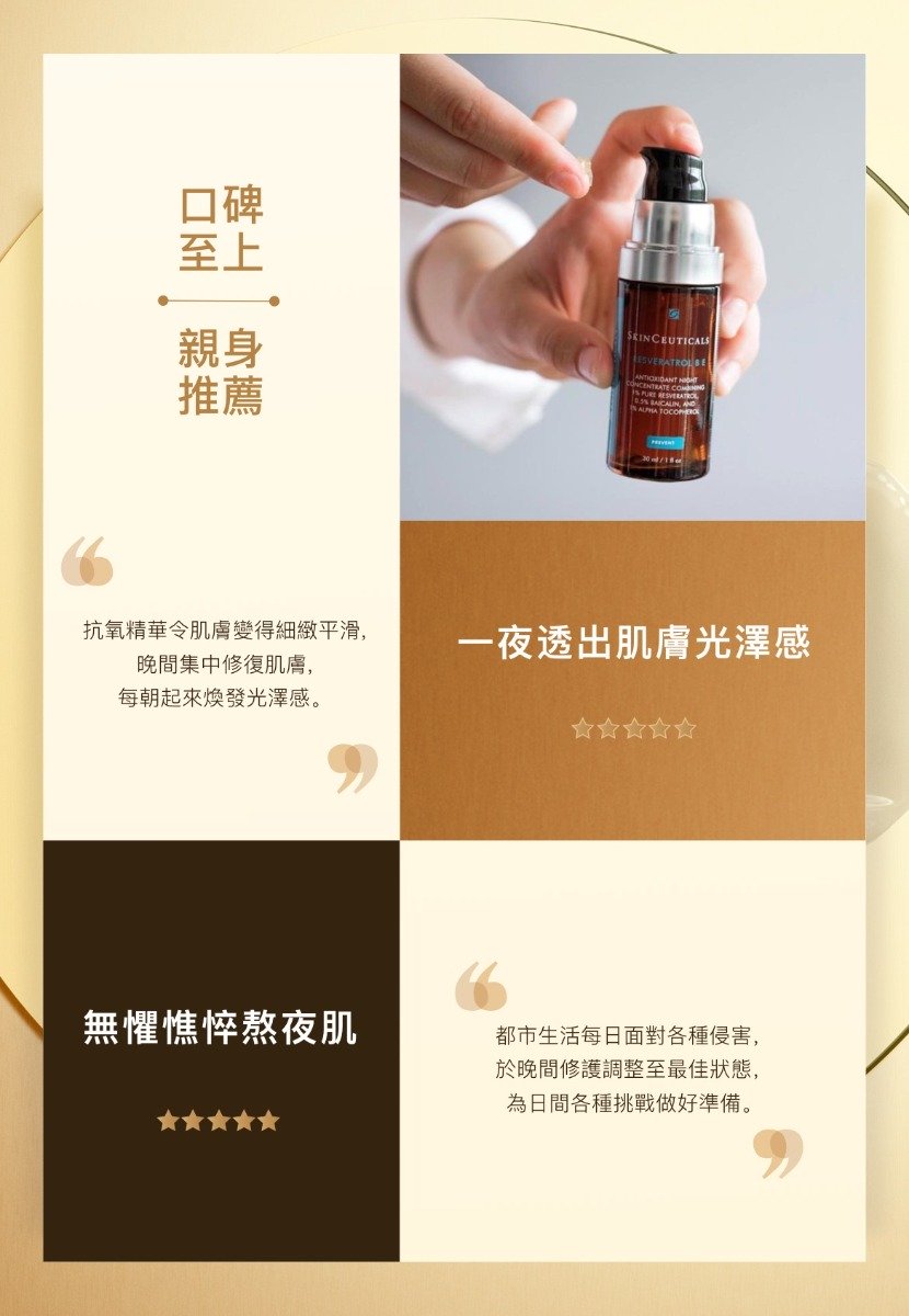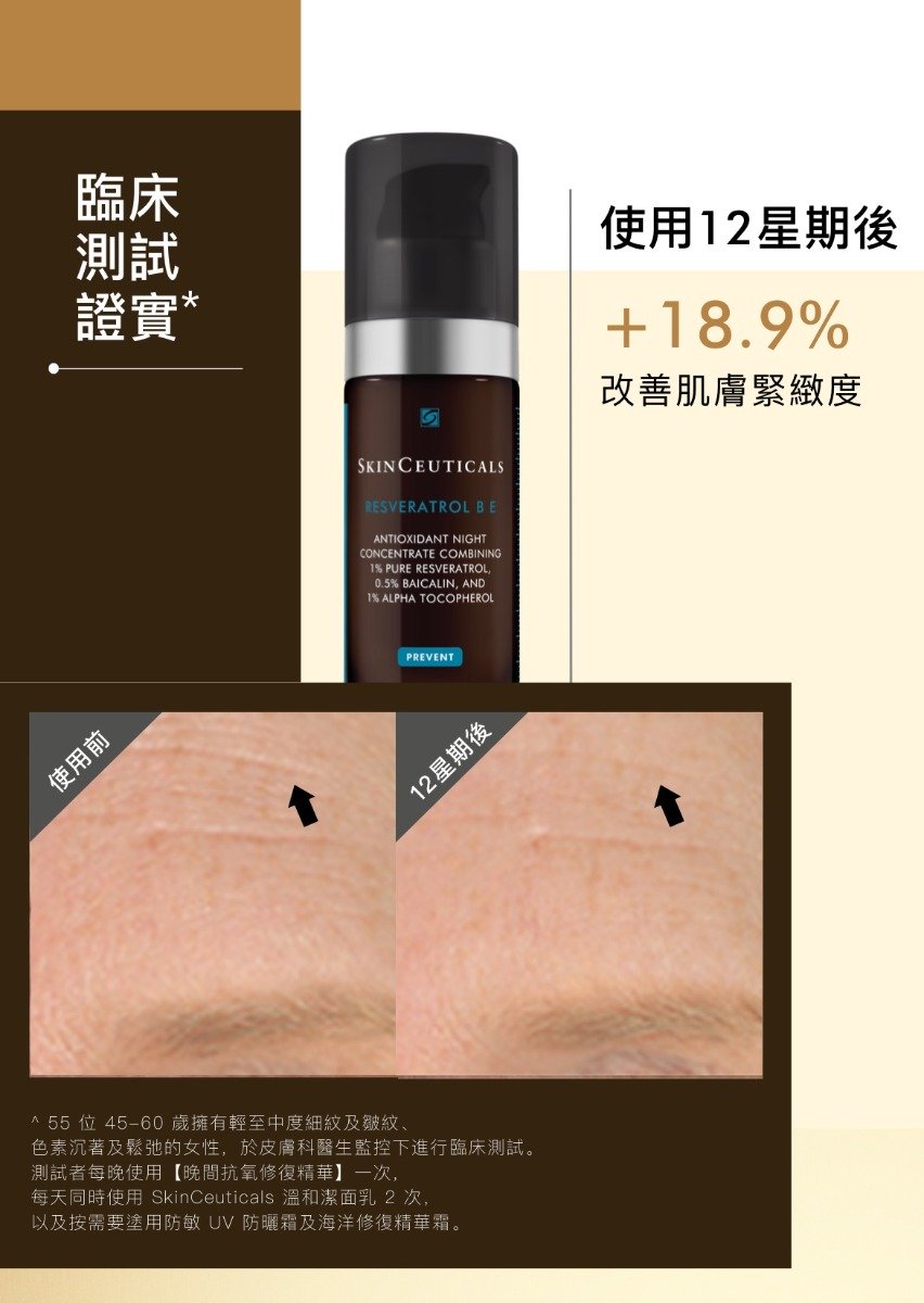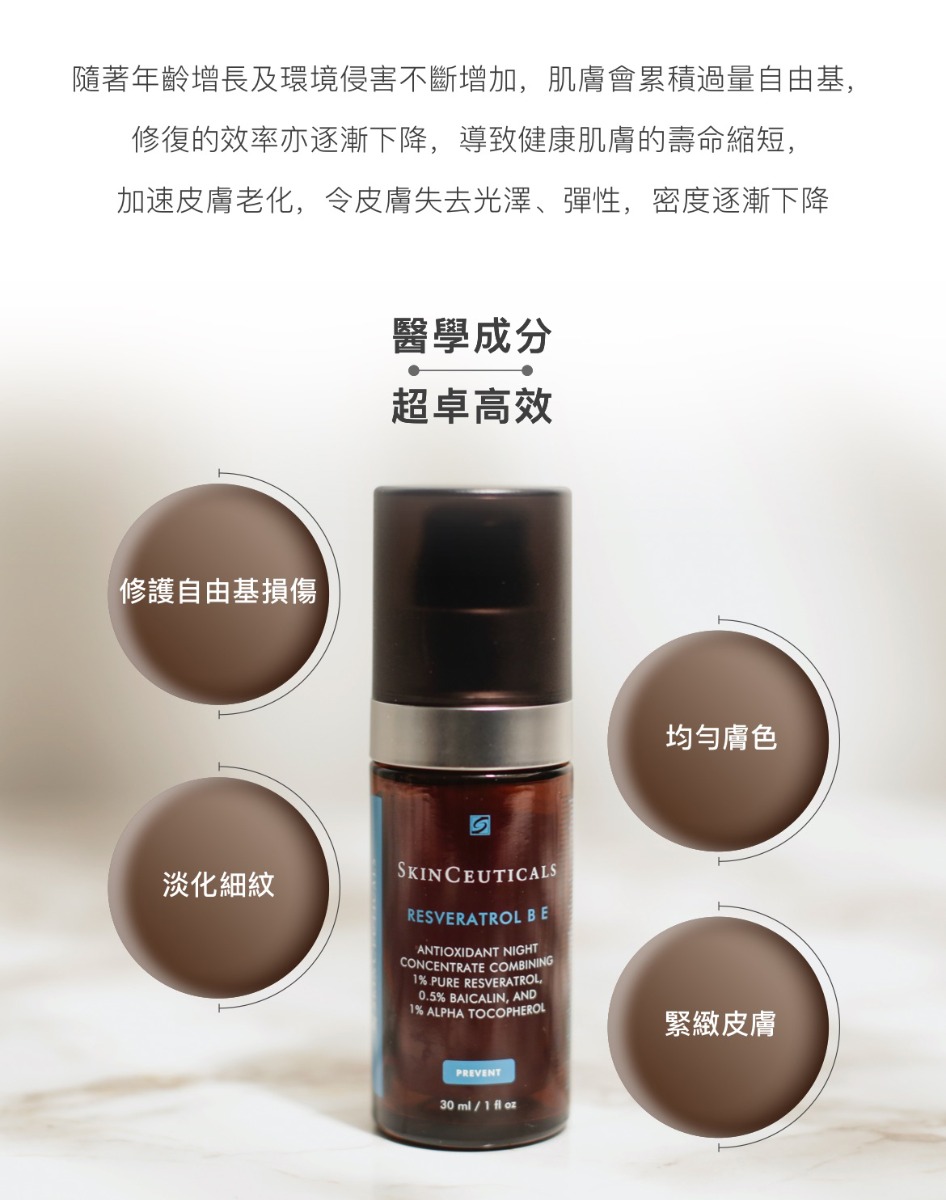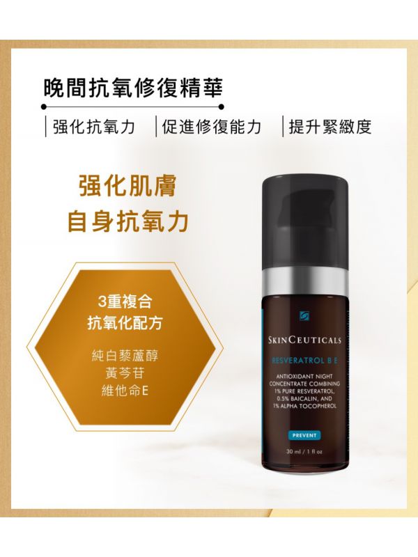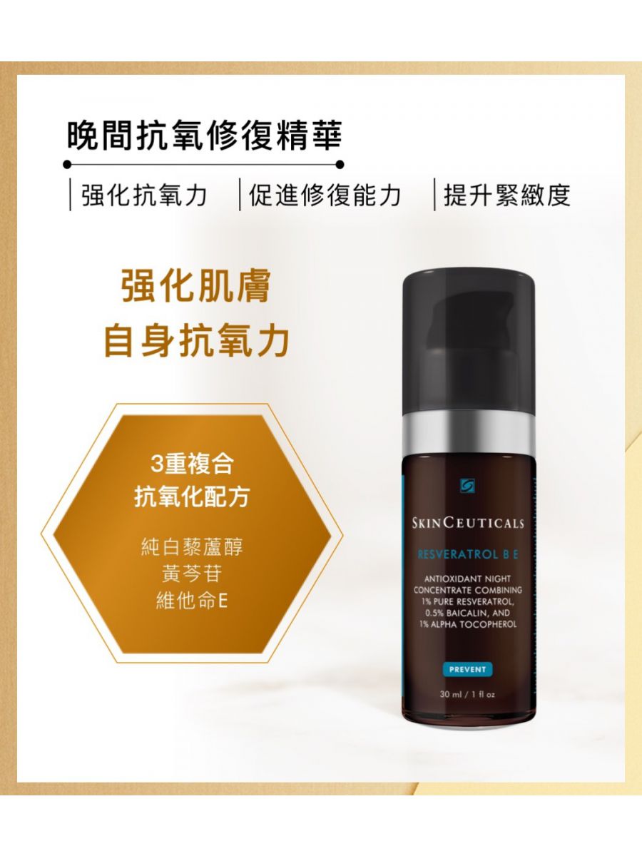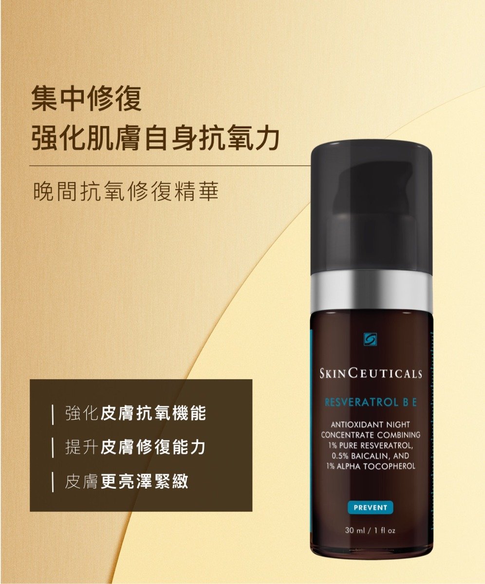 SkinCeuticals Resveratrol B E晚間抗氧修復精華的革命性高效配方,蘊含高濃度穩定性的純白藜蘆醇,能幫助中和細胞間的自由基,修復老化跡象,從而延展肌膚活力,保持肌膚健康年輕。