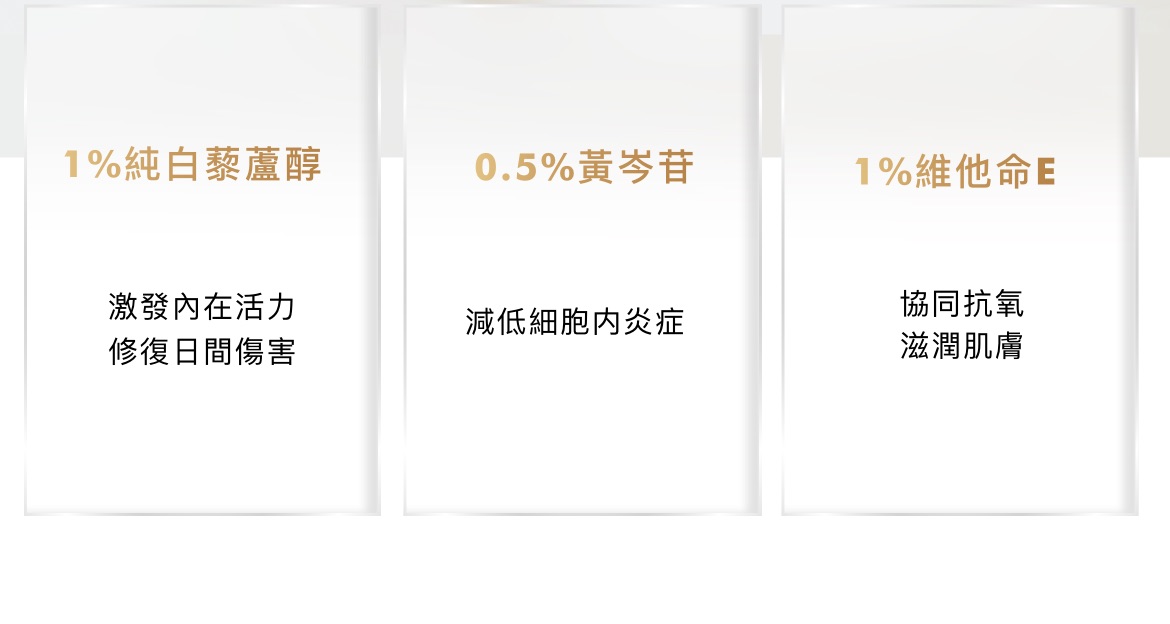 - 1%白藜蘆醇:由日本虎杖提取,強化皮膚內部的抗氧化防禦機制。
