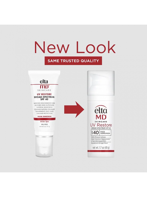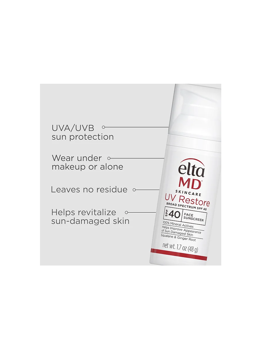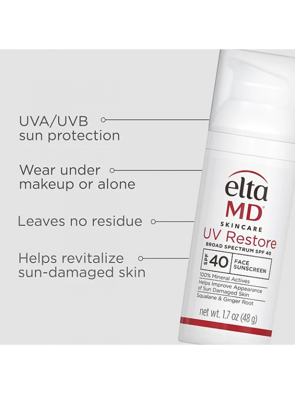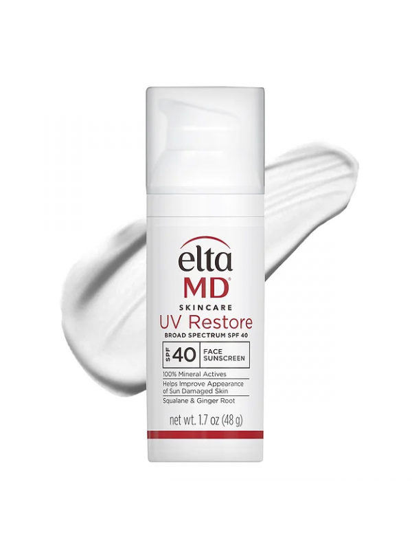 EltaMD 全物理極薄防曬乳 UV Restore Broad-Spectrum SPF 40 是100% 礦物防曬霜,可改善曬傷皮膚並幫助其恢復活力。配方富含角鯊烷,可恢復皮膚的天然水分和柔軟度。 UV Restore 採用薑根提取物和糖異構體,可改善皮膚光滑度、減少黑斑、細紋和皺紋的出現來促進健康的膚色。它含有抗氧化劑,可對抗與紫外線 (UV) 和紅外線輻射 (IR) 相關的皮膚老化自由基。